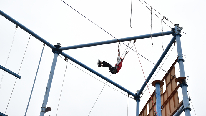 外训活动中,同学们在专业教练带领下开展了“破冰——团队建设”“高空断桥”“空中单杠”等拓展项目,其中高空项目对同学们的心理素质和团队合作精神都有着较高的考验。最终,所有队员在团队的鼓励下都战胜了自我,顺利完成了挑战。整场培训最后一个项目是毕业墙,参与培训的所有同学需要在不借助任何设备的情况下,通过一堵4米多高的高墙。这个项目需要同学们的通力合作,特别是部分充当底座同学的甘愿奉献,当最后一名同学被上面的同学以倒挂金钟的姿势拉上去的时候,全场同学振臂高呼“山师最棒”。