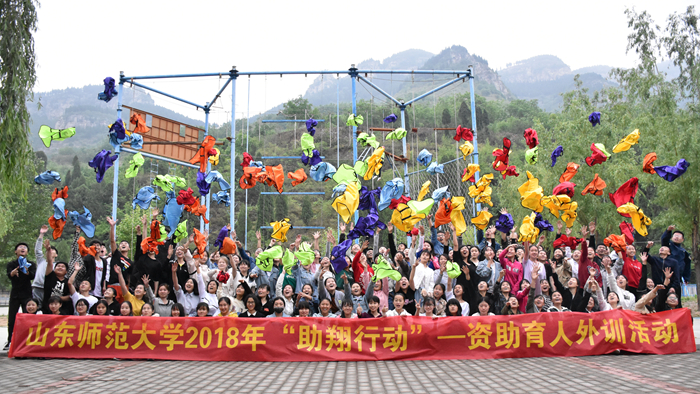 “助翔行动”——山东师范大学家庭经济困难资助育人体系建设目前由内训、外训及海外拓展三部分组成,是学生工作处着力打造的“物质保障、能力提升、精神激励”三位一体扶贫助学育人平台,系列培训活动的有效开展对于提升家庭经济困难学生的团队合作意识,培养人与人之间信任的关系,增强学生执行力和自信心起到了非常好的效果。